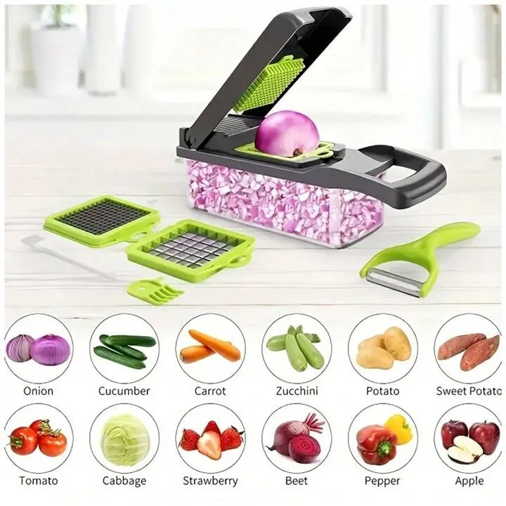 تحتوي على 12 شفرة حادة لقطع الخضر والفواكه بأشكال وأحجام مختلفة.
